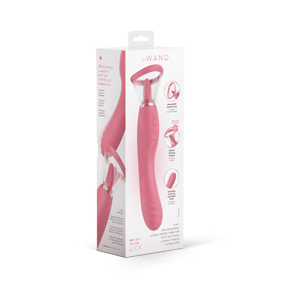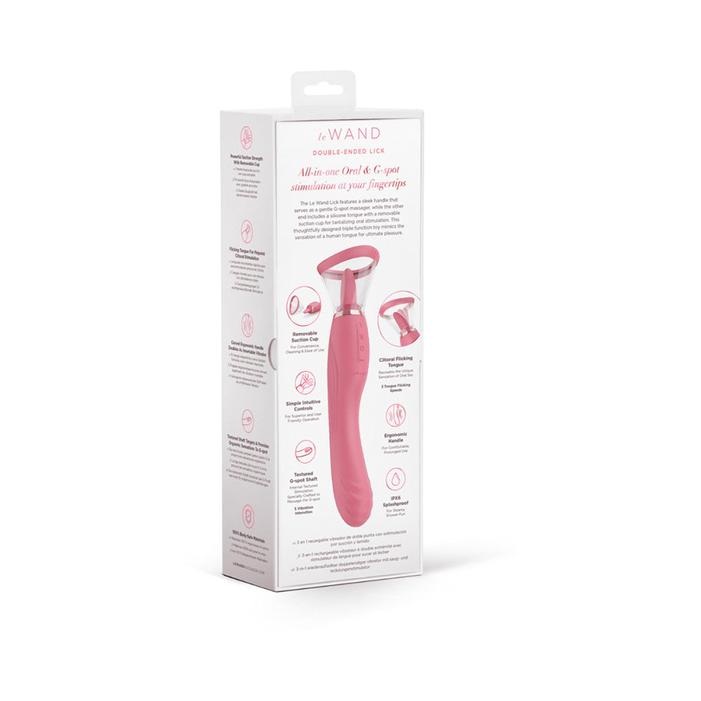 The Le Wand Lick is a 3-in-1 rechargeable double-ended vibrator featuring a sleek handle that serves as a gentle G-spot massager, while the other end includes a silicone tongue with a removable suction cup for tantalizing oral stimulation. This thoughtfully designed triple-function sex toy mimics the sensation of a human tongue for ultimate pleasure.